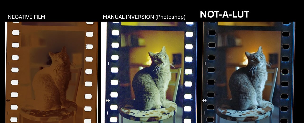 Unlike standard inversion pipelines, which often rely on arbitrary LUTs, or proprietary grading, not-a-LUT simulates the actual spectral response of photographic paper and film emulsions, providing a more faithful and consistent color inversion, especially for photographic negatives.